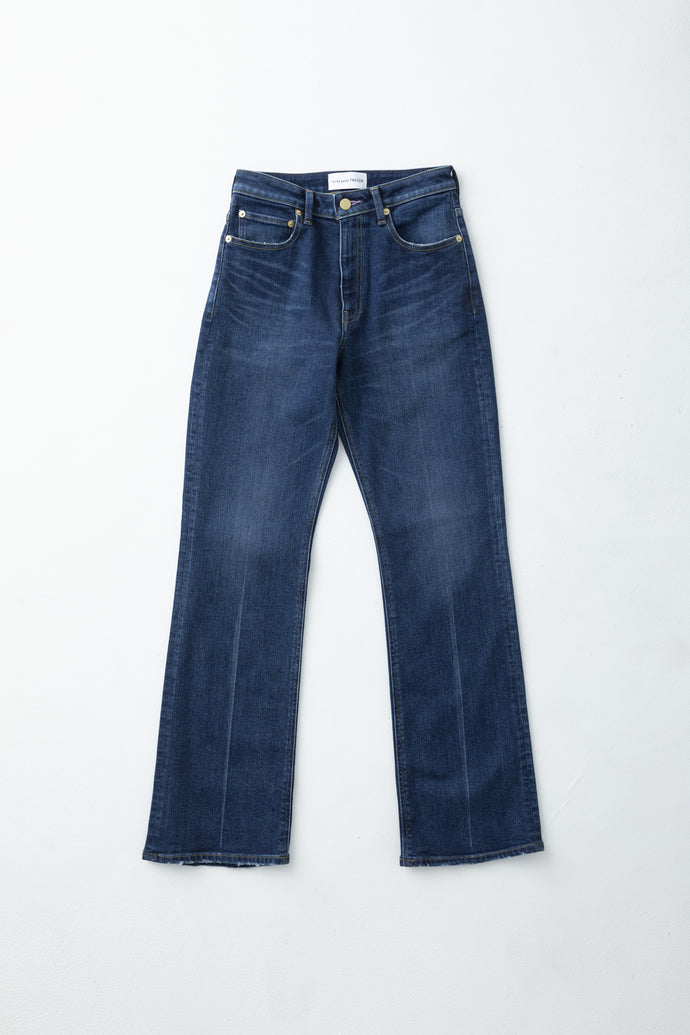 The Amethyst Jean is a slim-fit silhouette with a slight flare which, when worn, achieves a highly flattering, elongated look. This flare-leg silhouette is crafted from Japanese hybrid fiber denim lets the body move freely while being elegantly shaped. Each hand-finished pair is detailed with signature luxurious gold plated buttons and a custom buttonhole stitch in amethyst.